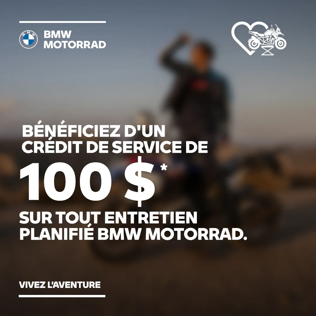 Condition légal: * 100 $ de bon d'achat à appliquer à l'entretien de votre moto BMW entre le 15 novembre 2025 et le 15 mars 2026. Disponible uniquement chez les revendeurs BMW Motorrad utilisant des pièces et des lubrifiants moteur d'origine BMW. Certaines restrictions s'appliquent. Adressez-vous à votre conseiller BMW Motorrad pour plus de détails.