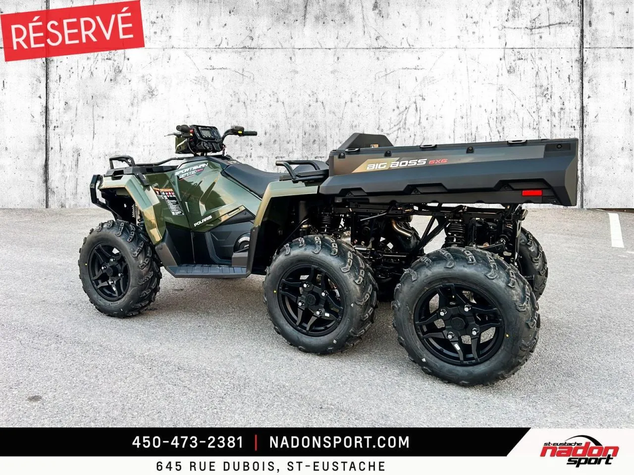 Polaris Sportsman 6x6 570 2026 : puissance et polyvalence extrêmes pour le travail et l’aventure. Le Polaris Sportsman 6x6 570 2026 est bien plus qu’un VTT utilitaire : c’est une invitation à explorer tous les terrains, accomplir vos tâches les plus exigeantes et profiter pleinement de la liberté tout-terrain. Conçu pour les pilotes à la recherche d’un parfait équilibre entre puissance, fiabilité et maniabilité, le Sportsman 6x6 570 s’impose comme une référence reconnue dans la catégorie VTT utilitaire 6x6. Il est offert ici en vert camo robuste avec finitions noir mat, pour un look durable et fonctionnel. Équipé d’un moteur bicylindre 567cc à injection électronique, le 6x6 570 offre couple généreux, traction exceptionnelle et stabilité même avec de lourdes charges, idéal pour travail forestier, transport de matériaux, sentiers accidentés et aventures hors route. Son châssis renforcé avec transmission intégrale 6x6, combiné à une suspension indépendante avant/arrière et une direction assistée, assure une conduite stable et confortable, même dans les conditions les plus exigeantes. Que vous rouliez sur le Québec, les Laurentides, routes de campagne ou sentiers escarpés, ce VTT garantit une expérience sécuritaire et performante. Côté design et équipement, le Sportsman 6x6 570 2026 se distingue par un style robuste et fonctionnel, et une technologie pensée pour performance, sécurité et confort : Direction assistée EPS pour un pilotage précis Traction intégrale 6 roues avec différentiel verrouillable Plateforme de chargement utilitaire à grande capacité Suspension indépendante à grand débattement Éclairage LED haute visibilité pour toutes les conditions Polaris signe ici un VTT utilitaire fiable, performant et polyvalent, taillé pour les travaux exigeants et les aventures extrêmes. Chez Nadon Sport à Saint-Eustache, nous proposons le Polaris Sportsman 6x6 570 2026 neuf à $, avec plusieurs options de financement flexibles, incluant la 1re, 2e et 3e chance au crédit. Venez le découvrir en concession et comprendre pourquoi il est considéré comme l’un des meilleurs VTT utilitaires du marché. Chez Nadon Sport, notre équipe accompagne les passionnés de sports motorisés du Québec depuis 1961, offrant un service personnalisé, des conseils d’experts et un accompagnement complet avant et après l’achat.