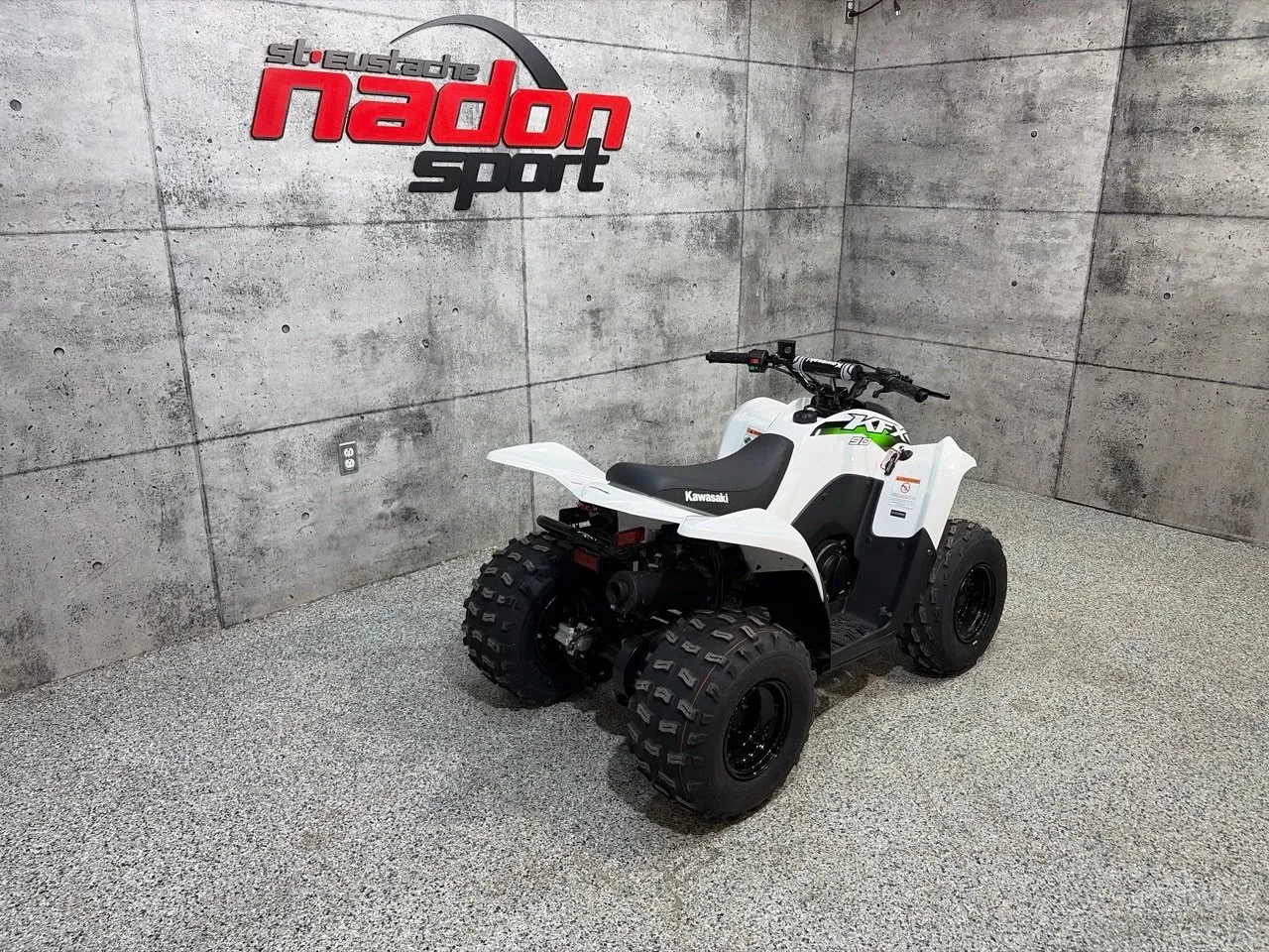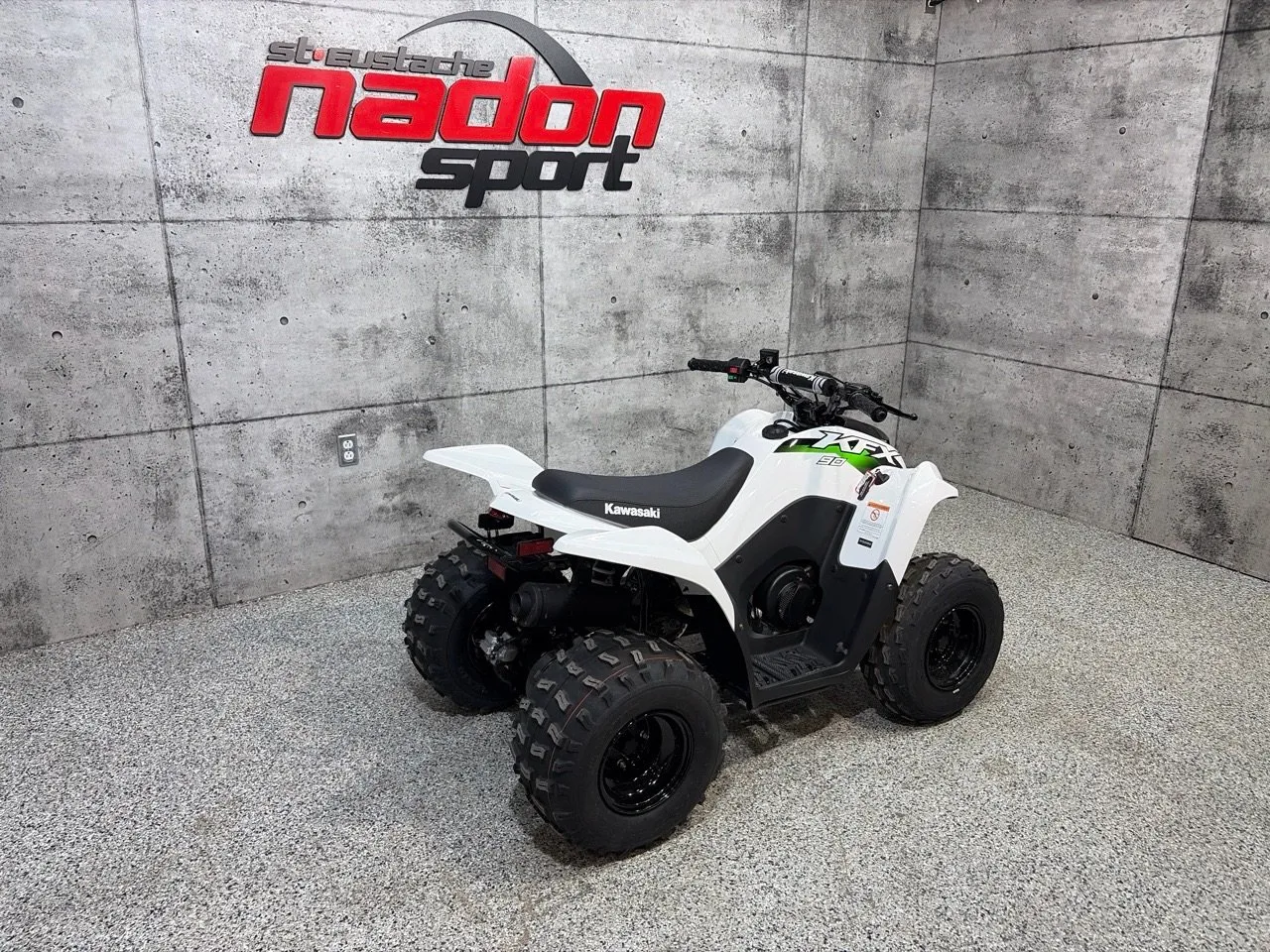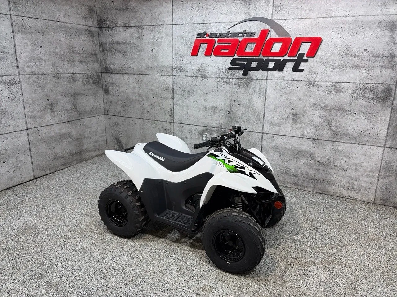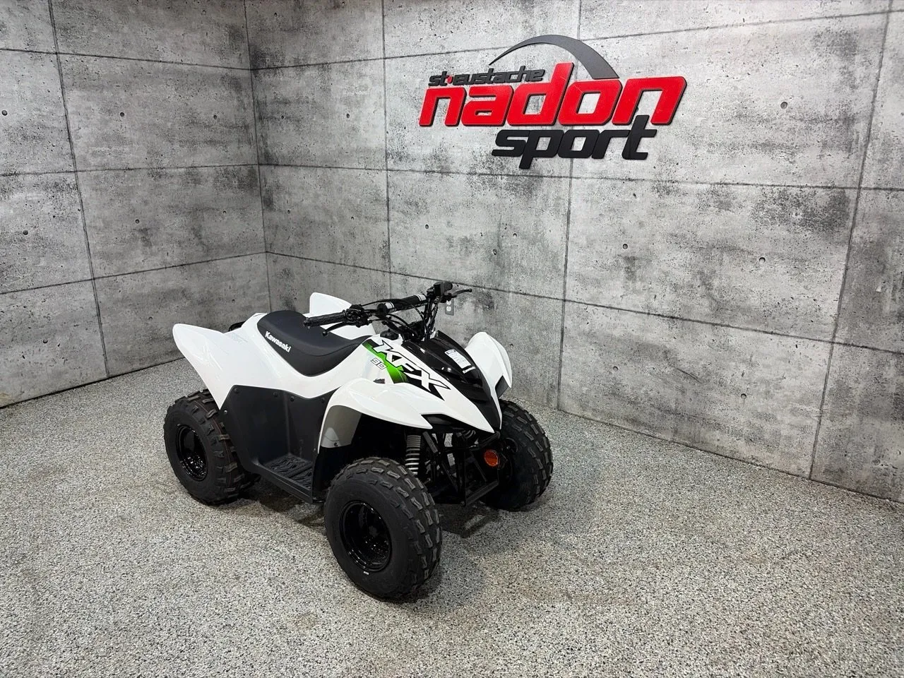 Kawasaki KFX90 2026 : Le premier pas vers l’aventure tout-terrain La Kawasaki KFX90 2026 est bien plus qu’un VTT jeunesse : c’est une invitation à la découverte, au plaisir de conduite et à l’apprentissage sécuritaire du hors route. Conçu pour les jeunes pilotes à la recherche d’un parfait équilibre entre maniabilité, fiabilité et sécurité, le KFX90 s’impose comme une référence reconnue dans la catégorie des VTT pour enfants et adolescents. Elle est offerte ici en vert Kawasaki emblématique, une teinte vive, sportive et énergique qui reflète l’ADN compétition de la marque. Équipé d’un moteur monocylindre 4 temps de 90 cc, refroidi par air et à carburateur, le KFX90 2026 offre une accélération douce et contrôlée, idéale pour l’initiation, les randonnées familiales et les sentiers hors route. Son châssis compact et robuste, combiné à une suspension confortable et une ergonomie adaptée aux jeunes pilotes, assure une prise en main facile, stable et rassurante, même dans des conditions exigeantes. Que ce soit sur les sentiers du Québec, dans les Laurentides ou sur un terrain privé, le KFX90 garantit une expérience de conduite sécuritaire et engageante. Côté design et équipement, le KFX90 2026 se distingue par un style sportif et moderne, accompagné d’une technologie pensée pour la sécurité et la tranquillité d’esprit des parents : Démarreur électrique avec démarreur à pied de secours Limiteur d’accélération ajustable Transmission automatique CVT Freins à tambour efficaces et faciles à doser Coupe-circuit de sécurité Kawasaki signe ici un VTT fiable, durable et polyvalent, taillé pour l’apprentissage et le loisir en toute confiance. Chez Nadon Sport à Saint-Eustache, nous proposons le Kawasaki KFX90 2026 neuf à